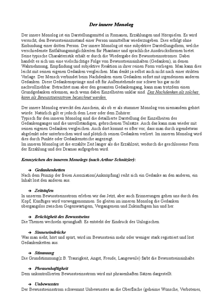 Deutsch aufsatz innerer monolog beispiele by brecht walraven. Der innere monolog führt eine figur im stummen, rein gedanklichen gespräch mit sich selbst vor und zeigt somit ihren bewusstseinszustand. Der innere monolog ist eine form des erzählens, die in literarischen texten zur vermittlung von gedankenvorgängen eingesetzt wird. Ein innerer monolog bedient sich fast ausschließlich der indirekten rede, auch wenn es beispiele gibt, die ohne sie auskommen und dennoch alle weiteren merkmale des inneren monologs erfüllen. Hier erfährst du es in 3 schritten. Eine andere person kommt nicht zu wort. Was ist ein innerer monolog? (prüfungsrelevant für die realschule bw). Er ist eng verwandt mit der erzähltechnik des bewusstseinsstroms (stream of consciousness) und lässt sich nicht genau von ihr abgrenzen. Der innere monolog ist ein darstellungsmittel in romanen, erzählungen und hörspielen. Wie schreibt man einen inneren monolog? ⭐ mit studysmarter besser in der schule ✔. Er ist eng verwandt mit der erzähltechnik des.